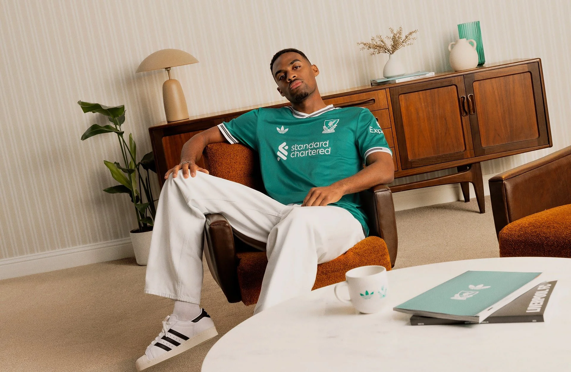 The first thing you notice about this shirt is the cream “Wonder White” base colour. It has a slightly vintage tone that instantly makes the shirt feel more premium and distinctive. In a season where many kits go for loud graphics or bright colours, this one feels refreshingly understated. It’s clean, classy, and still unmistakably Liverpool.