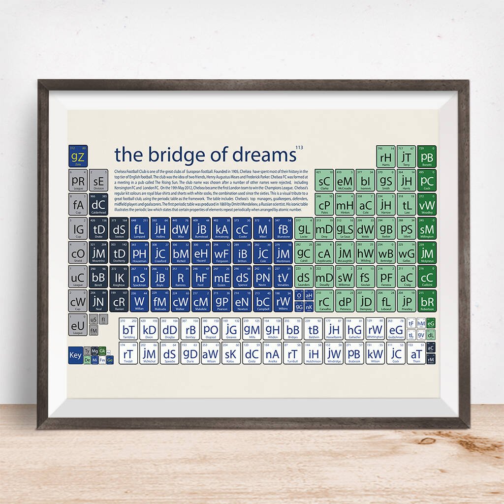 This Chelsea art print feels different to many others. Instead of the usual stadium shot, this print leans into something more creative. It’s built around a “periodic table” concept-each square representing a player from Chelsea’s history, complete with appearances and goal stats. It’s a very clever design which captures attention easily.